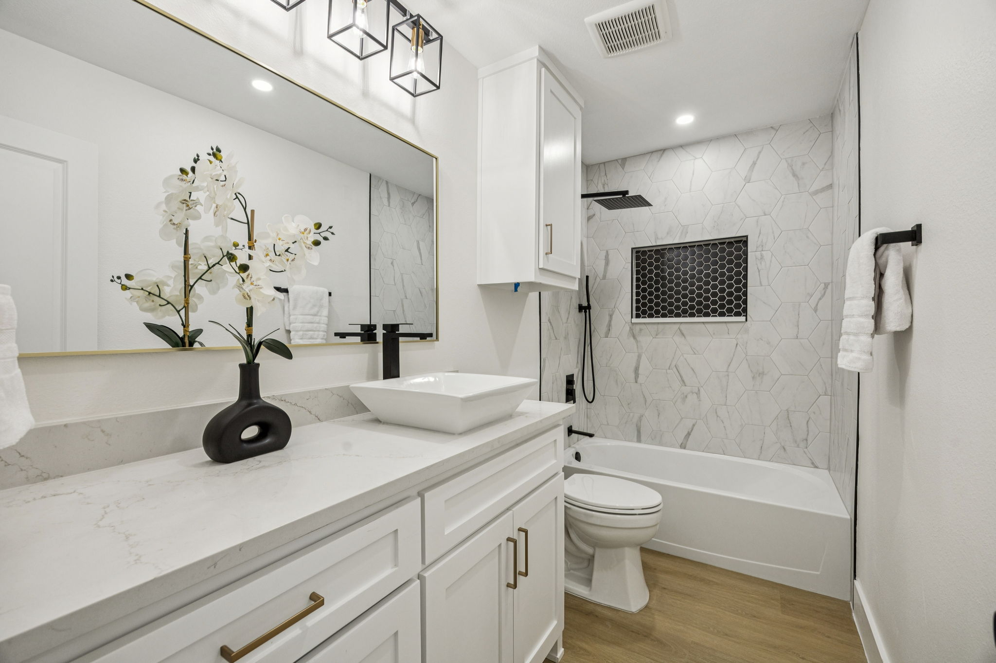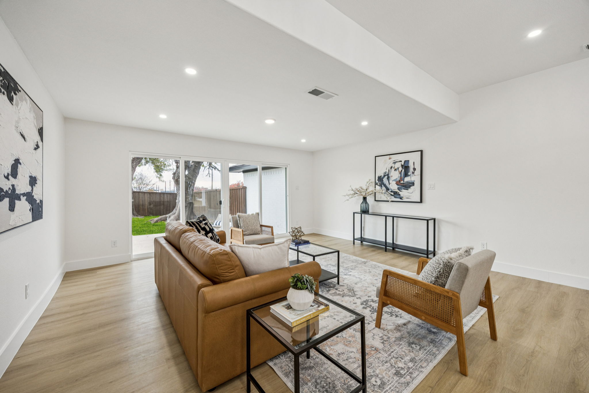 Updated lighting including recessed fixtures and ceiling fans